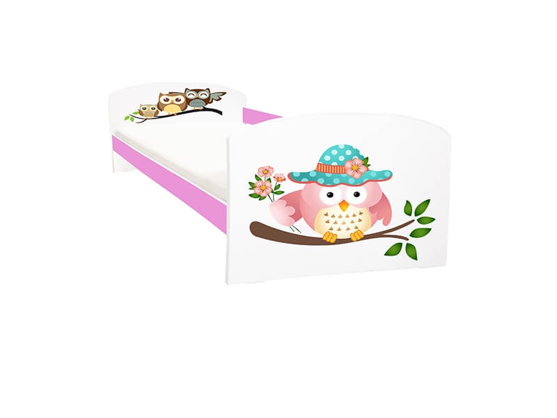 Patului pentru copii Bufnite roz i se potriveste saltea 180x80 cm.